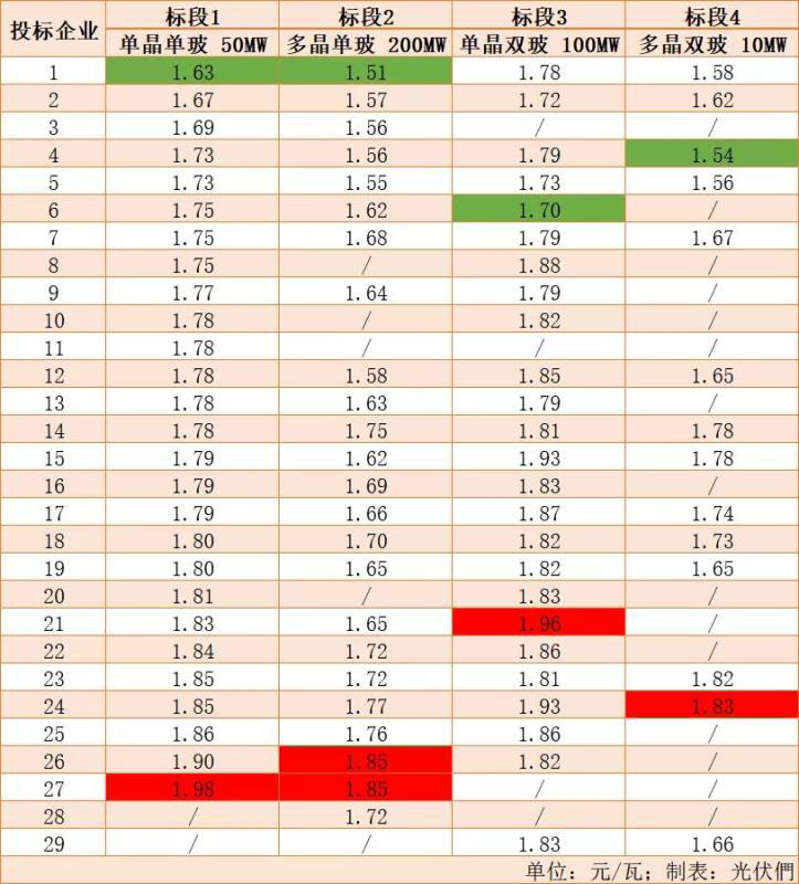根據(jù)招標文件中對投標報價的要求,此次報價為含稅、含運費(2000公里以內(nèi)),其中標段1、2需按TPT背板進行報價,標段3、4需按雙面組件(含鋁邊框)進行報價。但需要注意的是,此次招標并未明確規(guī)定組件功率,因此不同投標企業(yè)的報價也相差較大。