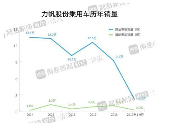 根據(jù)力帆股份的公布的數(shù)據(jù),2014-2018年,新能源汽車的銷量分別為1357輛、1.2萬輛、0.4萬輛、0.8萬輛、1萬輛。2019年1-9月僅銷售2035輛。