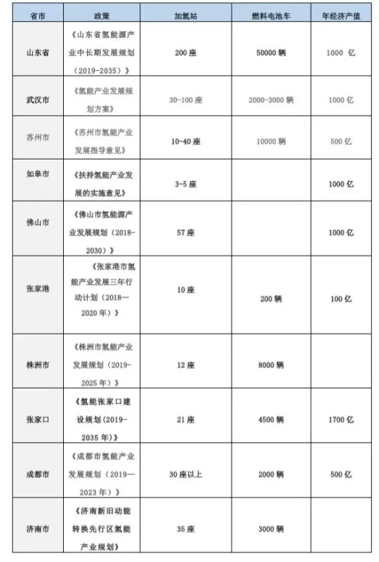 2019年6月,山東省發(fā)布《山東省氫能源產(chǎn)業(yè)中長期發(fā)展規(guī)劃(2019-2035)》。規(guī)劃提出,到 2025 年,全省氫能源產(chǎn)業(yè)增加值達到1000億元,燃料電池固定式發(fā)電裝機容量達到3200MW,燃料電池汽車應用規(guī)模達到 50000 輛,加氫站數(shù)量達到 200座。到 2035 年,規(guī)模質(zhì)量效益進一步提升,實現(xiàn)高質(zhì)量穩(wěn)健發(fā)展。