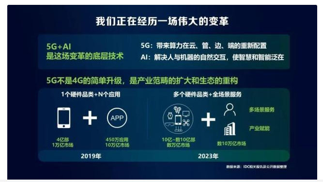 5G不是4G的簡(jiǎn)單升級(jí),是產(chǎn)業(yè)范疇的擴(kuò)大和生態(tài)重構(gòu)。在目前的4G時(shí)代,移動(dòng)互聯(lián)網(wǎng)廣泛應(yīng)用,人們習(xí)慣使用一個(gè)硬件+多個(gè)應(yīng)用。而隨著5G與物聯(lián)網(wǎng)的發(fā)展,將會(huì)有各種各樣的智能硬件設(shè)備如同潮水一般涌到用戶面前。預(yù)計(jì)2023年,將會(huì)發(fā)展成多個(gè)硬件+全場(chǎng)景服務(wù),設(shè)計(jì)多場(chǎng)景以及全產(chǎn)業(yè)鏈的應(yīng)用與賦能,這種重大變革主要體現(xiàn)在三個(gè)方面。