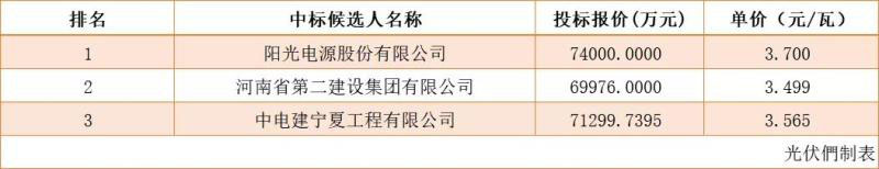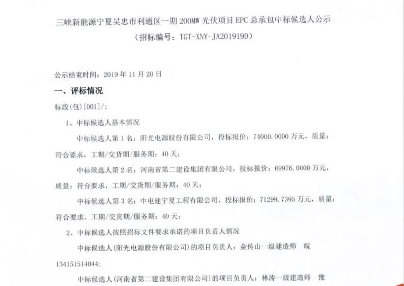 2019年11月18日,三峽新能源寧夏吳忠市利通區(qū)一期200MW光伏項(xiàng)目EPC總承包中標(biāo)候選人公示。其中,陽(yáng)光電源股份有限公司以總價(jià)74000萬(wàn)元,單價(jià)3.7元/瓦位列第一中標(biāo)候選人。值得一提的是,該價(jià)格為三名中標(biāo)候選人報(bào)價(jià)中的最高價(jià)。具體信息如下: