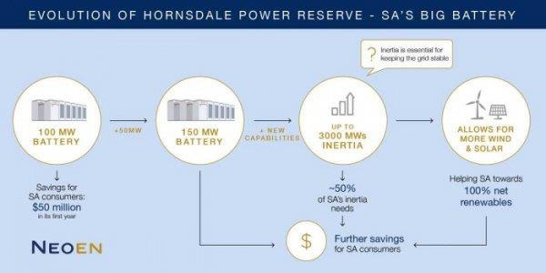 據(jù)悉,南澳大利亞電網(wǎng)需要6000MWs的慣性,Neoen表示,升級(jí)后的霍恩斯代爾儲(chǔ)能站可以滿足一半的慣性。