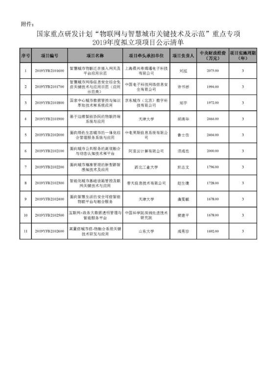 根據(jù)《國務(wù)院關(guān)于改進(jìn)加強(qiáng)中央財(cái)政科研項(xiàng)目和資金管理的若干意見》(國發(fā)〔2014〕11號(hào))、《國務(wù)院關(guān)于深化中央財(cái)政科技計(jì)劃(專項(xiàng)、基金等)管理改革方案的通知》(國發(fā)〔2014〕64號(hào))、《科技部、財(cái)政部關(guān)于印發(fā)<國家重點(diǎn)研發(fā)計(jì)劃管理暫行辦法>的通知》(國科發(fā)資〔2017〕152號(hào))等文件要求,現(xiàn)對“物聯(lián)網(wǎng)與智慧城市關(guān)鍵技術(shù)及示范”重點(diǎn)專項(xiàng)2019年度擬立項(xiàng)的項(xiàng)目信息進(jìn)行公示(詳見附件)。
