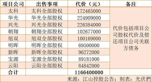 11月27日,江山控股發(fā)布公告,于2019年11月15日(聯(lián)交所交易時(shí)段后),其全資附屬公司江山永泰、項(xiàng)目公司(太科、華光、興光、朝翔、旭雙、明暉、新暉、寶源、云陽(yáng))與買(mǎi)方中核山東能源有限公司訂立出售協(xié)議,江山永泰有條件同意向買(mǎi)方出售項(xiàng)目公司(共持有10個(gè)光伏電站項(xiàng)目)全部股權(quán),總代價(jià)約1,166,400,000元。