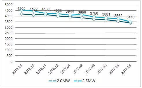 盡管2014-2015期間,由于出現(xiàn)風(fēng)電搶裝潮,風(fēng)機價格有小幅提升,但均價從未高于4500元/千瓦,2016年后更是一路下滑。