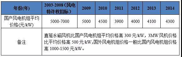 2003-2014年國內(nèi)風(fēng)電機組平均價格(來源:計鵬咨詢)