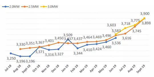 2019年以來,各機組投標(biāo)均價持續(xù)回升,且增幅不斷擴(kuò)大。2019年9月,2.5MW級別機組的投標(biāo)均價為3898元/千瓦,比去年8月份的價格低點回升17%;2019年第三季度,3.0MW級別機組的投標(biāo)均價均在3700元以上,9月達(dá)3900元/千瓦。