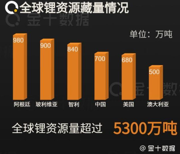 隨著各國(guó)開足馬力加速布局全球鋰市場(chǎng),中國(guó)又是如何應(yīng)對(duì)呢?雖然此前中國(guó)工業(yè)用鋰有80%需要依賴進(jìn)口,但是從資源藏量上來看,中國(guó)的鋰礦資源并不少。根據(jù)美國(guó)地質(zhì)調(diào)查局2018年最新報(bào)告顯示,全球鋰資源量超過5300萬噸,其中阿根廷占有980萬噸、玻利維亞占有900萬噸、智利占有840萬噸、中國(guó)占有700萬噸、美國(guó)占有680萬噸、澳大利亞占有500萬噸。