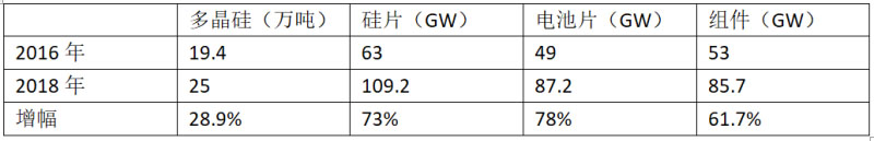 不僅在裝機(jī)目標(biāo)上實(shí)現(xiàn)了跨越式發(fā)展,“十三五”期間,我國(guó)光伏發(fā)電的技術(shù)水平、產(chǎn)能水平、降本空間等方面取得了突破。根據(jù)中國(guó)光伏行業(yè)協(xié)會(huì)統(tǒng)計(jì)數(shù)據(jù),與2016年底規(guī)模相比,到2018年,我國(guó)光伏產(chǎn)業(yè)鏈各環(huán)節(jié)產(chǎn)量的增幅幾乎均超過(guò)50%。2019年,中國(guó)光伏市場(chǎng)的寡頭效應(yīng)愈發(fā)明顯,龍頭企業(yè)的擴(kuò)產(chǎn)腳步依舊頻繁,可以預(yù)見(jiàn)的是,到“十三五”末期,下表中的增幅還將進(jìn)一步擴(kuò)大。