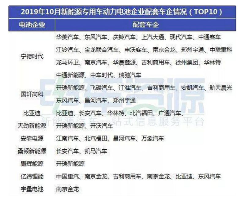 主要動力電池企業(yè)配套新能源專用車廠商情況