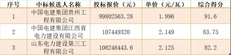 中國儲能網(wǎng)訊:11月28日,南網(wǎng)能源公示貴州省興義市烏沙鎮(zhèn)牛膀子50MWp林業(yè)光伏電站項目EPC總承包中標候選人,中國電建集團貴州工程有限公司以總價99802563.28元、單價1.996元/瓦成為第一中標候選人擬中標,需要注意的是,該價格不含組件在內(nèi)。