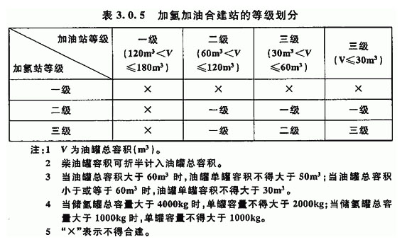 在建站標準方面,目前油氫合建站能夠依據(jù)的僅有2010年制定的《加氫站技術(shù)規(guī)范GB50516-2010》(后有推出《加氫站安全技術(shù)規(guī)范》GB/T34584-2017,但非強制性國家標準),其中3.0.1規(guī)定,加氫站可與天然氣加氣站或加油站聯(lián)合建站(等級劃分如下圖);3.0.9規(guī)定,加氫加油合建站、加氫加氣合建站中的加油、加氣設(shè)施的設(shè)計、施工,應(yīng)符合現(xiàn)行國家標準《汽車加油加氣站設(shè)計與施工規(guī)范》GB50156的有關(guān)規(guī)定。