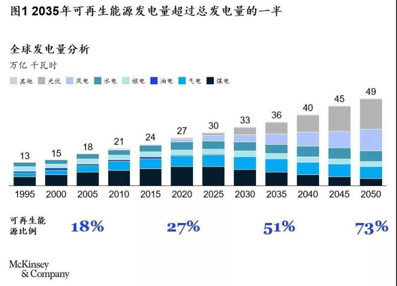 隨著行業(yè)供應(yīng)鏈日趨成熟,儲(chǔ)能成本大幅下降,早期對(duì)可再生能源發(fā)展高成本及電力供應(yīng)不穩(wěn)定等的擔(dān)憂逐步平息。以北美地區(qū)為例,從2012到2018年,陸上風(fēng)電發(fā)電成本由0.072美元/千瓦時(shí)降至今日的0.042美元/千瓦時(shí);電池成本也從2013年的650美元/千瓦時(shí)下降到了2018年的176美元/千瓦時(shí)。麥肯錫預(yù)測(cè),未來可再生能源需求有望大幅提升,發(fā)電量占比將從今日的25%飛速提升至2035年的51% (見圖1)。