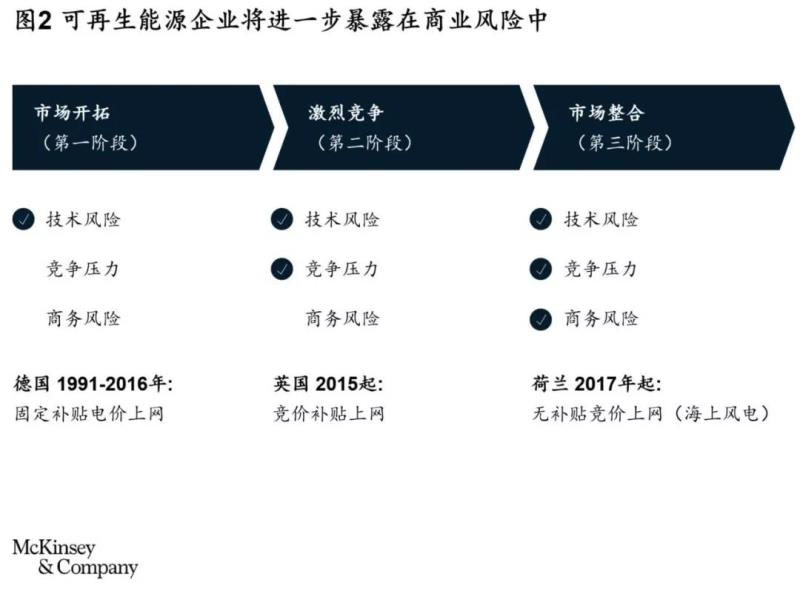 市場(chǎng)環(huán)境也日趨復(fù)雜。電網(wǎng)的要求日益增高,可再生能源公司需承擔(dān)起平衡電網(wǎng)系統(tǒng)的責(zé)任,如按需峰谷減產(chǎn),增加站點(diǎn)儲(chǔ)能能力等。除此之外,可再生能源補(bǔ)貼政策和購(gòu)電協(xié)議(PPA)的收入份額下降,項(xiàng)目商業(yè)條款更加嚴(yán)格等,也會(huì)讓可再生能源公司面臨更多潛在風(fēng)險(xiǎn)(見圖2)。在這個(gè)快速發(fā)展的行業(yè)中,什么才是成功的關(guān)鍵,什么樣的玩家才能獲勝呢?