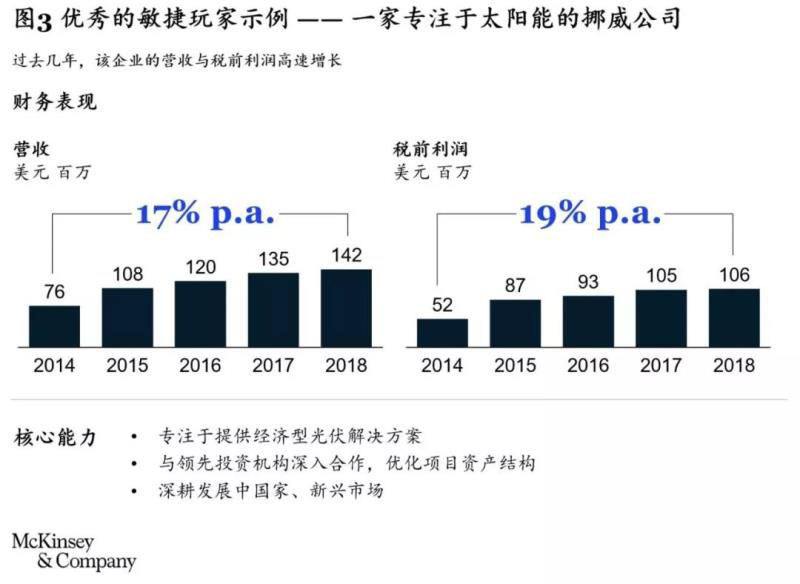 專業(yè)化的敏捷玩家,如哥本哈根CIP(活躍的可再生能源資產(chǎn)開發(fā)和基金管理公司)、Van Oord(海上風(fēng)電建設(shè))等。這類利基玩家或精通特定技術(shù),或掌握了價(jià)值鏈中某個(gè)環(huán)節(jié)的專業(yè)知識(shí),藉此搶占利基市場(chǎng)(見圖3)。