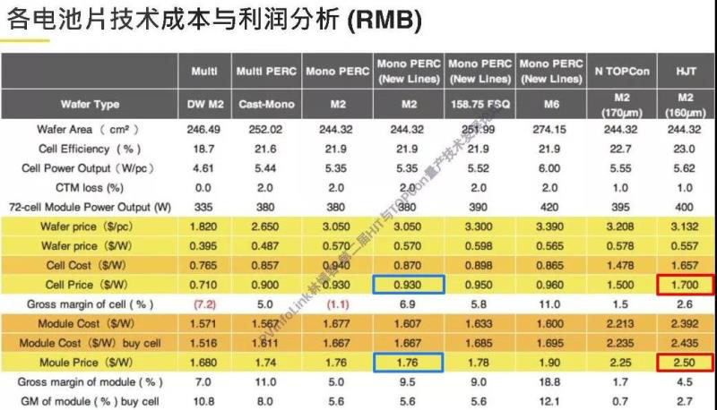 從PV InfoLink列出的電池片技術(shù)成本與利潤分析也可看出,異質(zhì)結(jié)電池目前較PERC而言仍有一定差距,亟待成本繼續(xù)下降。據(jù)了解目前異質(zhì)結(jié)組件售價仍在2.5元/瓦左右,而今年下半年以來單、多晶組件價格都在快速下降,單晶PERC組件均價1.77元/瓦、普通多晶組件1.61元/瓦。