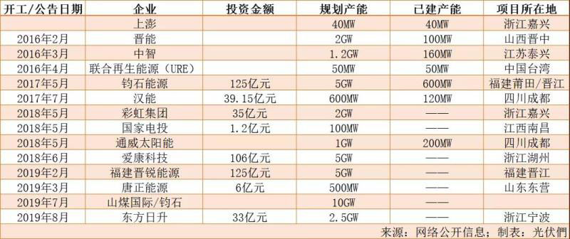 異質(zhì)結(jié)的擴產(chǎn)風(fēng)潮自2018年起就已興起,彩虹集團、國家電投、通威太陽能、愛康科技先后宣布進軍異質(zhì)結(jié)領(lǐng)域。2019年,山煤國際宣布將與鈞石能源共建10GW異質(zhì)結(jié)項目,這是目前已公開的規(guī)劃產(chǎn)能最大的異質(zhì)結(jié)擴產(chǎn)計劃。