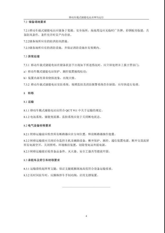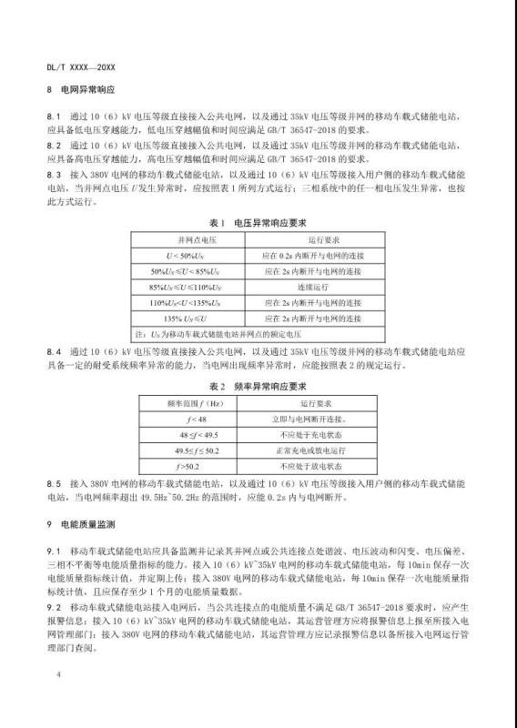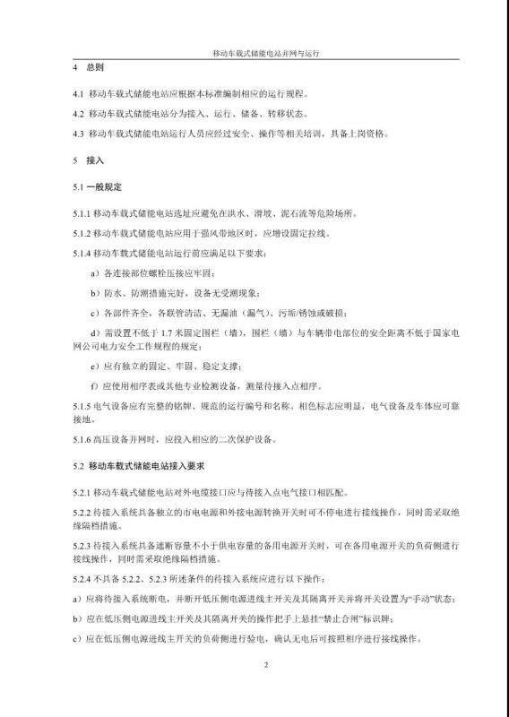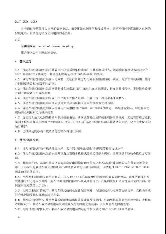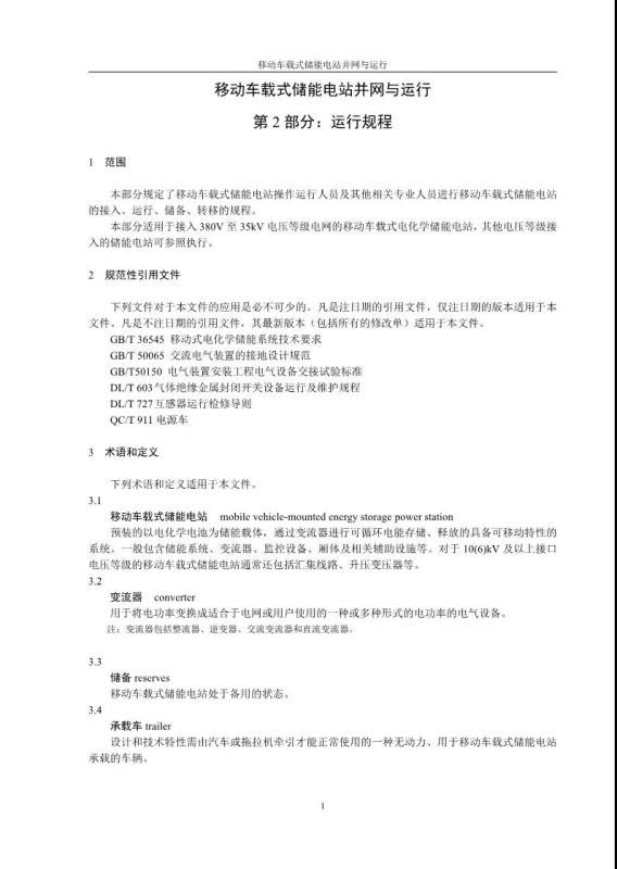 第一 部分“并網(wǎng)技術(shù)條件”:規(guī)定了移動(dòng)車載式儲(chǔ)能電站在并網(wǎng)/離網(wǎng)控制、有功功率控制、無功電壓調(diào)節(jié)、電網(wǎng)異常響應(yīng)、電能質(zhì)量監(jiān)測、通信與自動(dòng)化、繼電保護(hù)及安全自動(dòng)裝置、防雷接地方面的運(yùn)行技術(shù)條件;適用于接入380V至35kV電壓等級(jí)電網(wǎng)的移動(dòng)車載式儲(chǔ)能電站,其他電壓等級(jí)接入的移動(dòng)車載式儲(chǔ)能電站可參照?qǐng)?zhí)行。