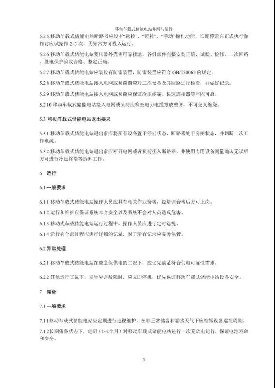 第二部分“運(yùn)行規(guī)程”:規(guī)定了移動(dòng)車載式儲(chǔ)能電站操作運(yùn)行人員及其他相關(guān)專業(yè)人員進(jìn)行移動(dòng)車載式儲(chǔ)能電站的接入、運(yùn)行、儲(chǔ)備、轉(zhuǎn)移的規(guī)程;適用于接入380V 至35kV 電壓等級(jí)電網(wǎng)的移動(dòng)車載式電化學(xué)儲(chǔ)能電站,其他電壓等級(jí)接入的儲(chǔ)能電站可參照?qǐng)?zhí)行。