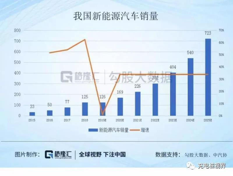 今年我國汽車銷量預(yù)計達到2569萬輛,假設(shè)汽車行業(yè)2020-2025年復(fù)合增速為2%,銷量達到2893萬輛,新能源汽車銷量預(yù)計是126萬輛。2025年新能源汽車滲透率為25%,對應(yīng)國內(nèi)新能源汽車銷量為723萬輛,則2019-2025年復(fù)合增速達34%。34%相比2018年之前的增速要低很多,今年由于補貼退坡因素增長乏力,未來補貼退坡減弱,這個增速是比較合理的。