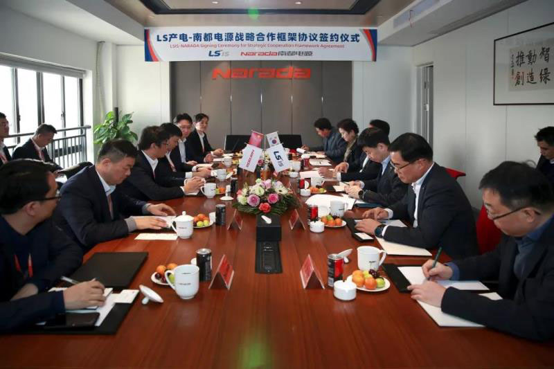 LS產(chǎn)電會(huì)長具滋均、社長樸龍祥、本部長魚勝圭、總經(jīng)理魚瀅國,南都電源總裁朱保義、副總裁吳賢章、總工程師陳建、總裁助理陳麗穎等出席簽約儀式。