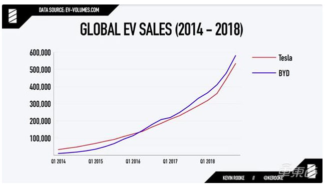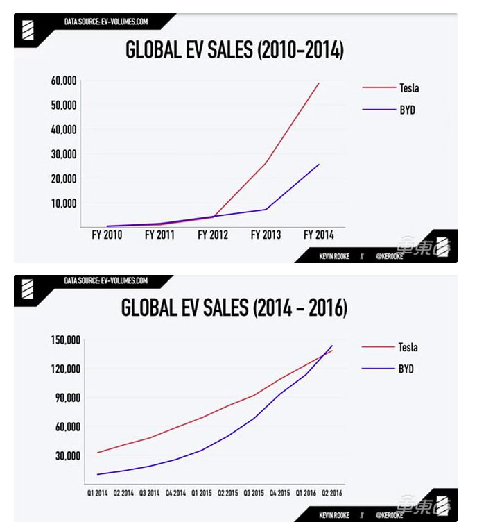 國外數(shù)據(jù)專家Kevin Rooke在2010年以來一直在對特斯拉和比亞迪的累計銷量做統(tǒng)計,通過統(tǒng)計數(shù)據(jù)可以看出雙方一直在互相追趕和超越。
