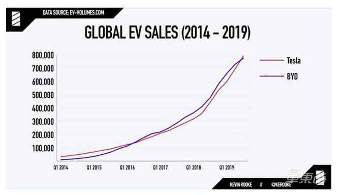 國外的一位數(shù)據(jù)專家Kevin Rooke對特斯拉和比亞迪的銷量進行了長期的跟蹤和統(tǒng)計。他于近日發(fā)布視頻表示,特斯拉的累計銷量目前已經(jīng)超過比亞迪,截至2019年10月,特斯拉累計已交付807954輛電動汽車,而比亞迪迄今為止則累計交付787150輛電動汽車。