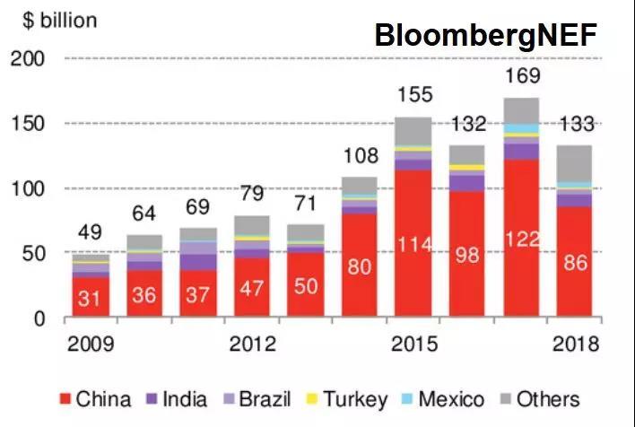 然而投資額的減少并不僅限于中國。印度和巴西清潔能源項(xiàng)目獲得的資金較上年分別下降了24億美元和27億美元。縱觀報告覆蓋的所有新興市場,2018年總投資降至1330億美元,不僅低于2017年,也低于2015年的數(shù)字??傮w而言,太陽能和風(fēng)電成本的降低是新興經(jīng)濟(jì)體投資額絕對值減少的重要因素。