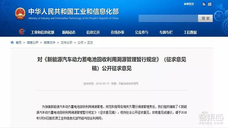 ▲ 工信部發(fā)布的《新能源汽車動(dòng)力蓄電池回收利用溯源管理暫行規(guī)定》(征求意見(jiàn)稿)