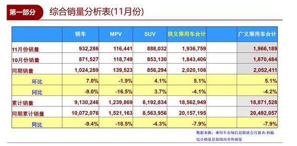 昨日(12月9日),乘用車市場(chǎng)信息聯(lián)席會(huì)(以下簡(jiǎn)稱“乘聯(lián)會(huì)”)發(fā)布數(shù)據(jù)顯示:11月,我國(guó)狹義乘用車銷量達(dá)到1936759輛,環(huán)比上漲5.1%,同比下滑4.1%,下滑幅度繼續(xù)小幅收窄;推動(dòng)1-11月累計(jì)銷量同比下滑進(jìn)一步收縮至7.9%,達(dá)到18562949輛。