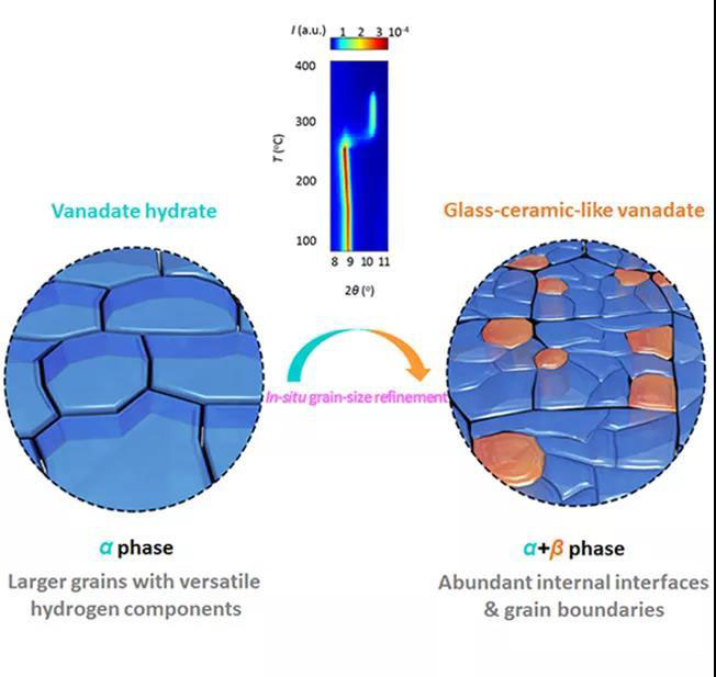 與傳統(tǒng)自下而上合成納米-微米材料的方法(如噴霧造粒、共沉淀自組裝等)不同,該研究采用了一種自上而下的微米-納米材料合成策略——首先合成微米級釩酸鹽前驅(qū)體,再通過低溫相轉(zhuǎn)變過程引入類玻璃-陶瓷相中間態(tài),同時(shí)晶粒發(fā)生細(xì)化,從而得到微米級致密納米晶電極材料(如圖1所示)。這種具有類玻璃-陶瓷相的釩酸鹽電極材料不僅具有豐富的晶界/相界面,以保證鋰離子的快速傳輸,同時(shí)具有較小的比表面積,以減少與電解液之間的表面副反應(yīng)?;谏鲜鰞?yōu)勢,該釩酸鹽正極材料表現(xiàn)出優(yōu)異的大倍率、高容量和長循環(huán)的電化學(xué)性能。這一合成策略對其他前驅(qū)體為水合物的過渡金屬氧化物電極材料同樣具有普適性,也為儲能材料中的微米-納米結(jié)構(gòu)設(shè)計(jì)提供新思路。
