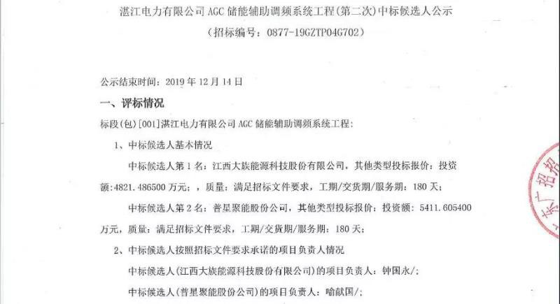 12月11日,湛江電力公司AGC儲(chǔ)能調(diào)頻項(xiàng)目發(fā)布中標(biāo)候選人公示,江西大族能源科技公司成為第一中標(biāo)候選人,其投標(biāo)報(bào)價(jià)約為4821萬(wàn)元。