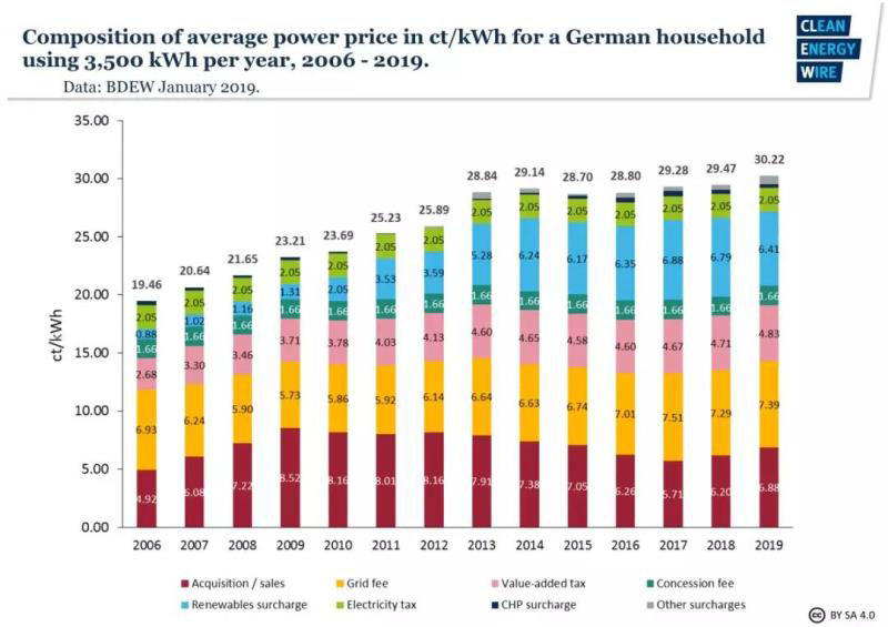 由此可見,在德國可再生能源附加費一項就占居民電費的21.2%,合人民幣0.50元/千瓦時。