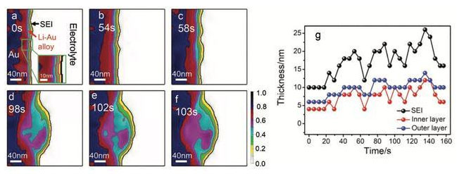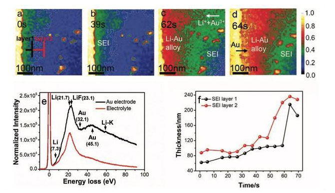 為了分析SEI膜的形成過程,作者對前64s時間內(nèi)Au電極表面的SEI膜變化過程進行了分析(如下圖所示),從下圖a可以看到開始形成的SEI膜分為兩層:1)位于電極表面的內(nèi)層無機物層;2)靠近電解液的外層有機物層。這與之前研究者認為的內(nèi)層主要是高密度的無機物層(Li2CO3, LiF, Li2O),外層時低密度的有機物層((CH2OCO2Li)2,ROLi, ROCO2Li)的結(jié)論是一致的。