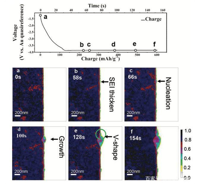 下圖為34C充電過程中SEI膜和金電極的變化,從下圖a可以看到金電極呈現(xiàn)出多晶結(jié)構(gòu),晶體顆粒的平均直徑為100nm,從圖b和c可以看到SEI膜的厚度也是不均勻的,局部SEI膜的厚度與Li-Au合金的成核和生長密切相關(guān)。從下圖d和e可以看到,在Li-Au合金成核后會導(dǎo)致局部的體積發(fā)生巨大的膨脹,從而對SEI膜形成張力,使得局部的SEI膜變薄,保護性降低,進而加速局部SEI膜的生長速度,再使得該處SEI膜厚度增加。