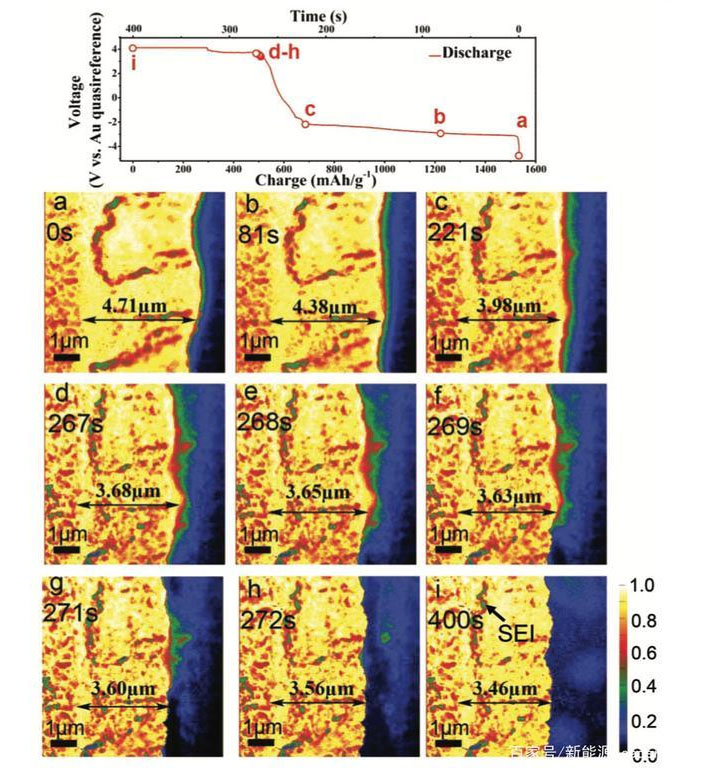 Chen Hou采用的研究方法使得我們首次能夠直觀地觀察到SEI膜的產(chǎn)生和生長,以及失效的過程,研究表明SEI膜在電極表面呈現(xiàn)出典型的雙層結(jié)構(gòu)特點,其中內(nèi)層為無機成分,而外層為有機成分,剛形成的SEI膜疏松多孔,電解液會通過這些孔隙進入,在電極表面發(fā)生分解,填充這些孔隙,進而產(chǎn)生致密的SEI膜。但是在電極體積膨脹的過程中會對SEI膜形成張力,導(dǎo)致SEI膜變薄,從而導(dǎo)致電解液繼續(xù)發(fā)生分解,引起SEI膜的生長。在快速放電的過程中,由于電極的體積快速收縮,因此SEI膜會遭到一定程度的破壞,當內(nèi)層的無機物層裸露后會發(fā)生溶解,進而導(dǎo)致整個SEI膜層的剝落,引起SEI膜的失效。