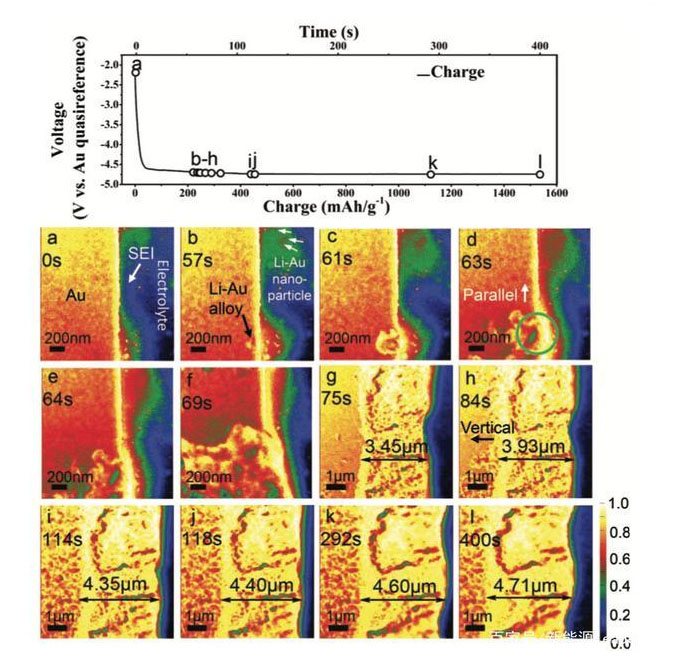 從圖中能夠看到SEI膜的生長與Li-Au合金的生長之間關(guān)系密切,SEI膜在Li-Au合金成膜之前就已經(jīng)形成,這主要是因為在Au電極表面還原的Li同時參與了Li-Au合金的形成和電解液的分解,隨后Li-Au合金呈現(xiàn)勻速生長的趨勢,但是SEI膜的生長并非勻速的,而是呈現(xiàn)一個搖擺式的速度變化,這主要是因為開始的時候Li-Au合金引起的體積膨脹引起SEI膜受到張力,使得SEI膜變薄,保護性變?nèi)?,使得SEI膜生長加速。但是隨著SEI膜厚度的增加,SEI膜的保護性增強,進而降低了電解液的分解速度,使得SEI膜生長速度又發(fā)生降低。