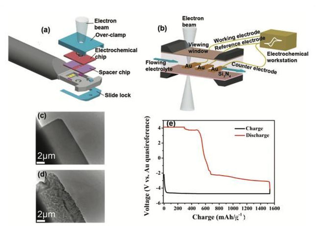 Chen Hou通過下圖所示的裝置研究了在34C大倍率下充放電過程中,金電極表面SEI膜的生長和破壞過程,之所以選擇金作為工作電極,主要是因為在之前的研究中有學(xué)者觀察到了金表面形成SEI膜的現(xiàn)象,同時在脫嵌鋰的過程中金電極也會產(chǎn)生巨大的體積膨脹,能夠模擬上述的SEI膜在金屬Li或Si負極表面在充放電過程中經(jīng)歷的體積膨脹。從下圖c和d可以看到在經(jīng)過了一個充放電循環(huán)后金的表面已經(jīng)因為體積變化產(chǎn)生了許多裂紋和微孔。