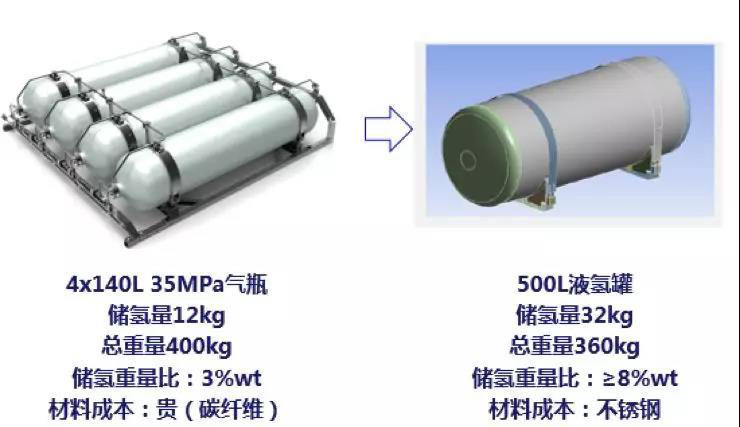 清華大學(xué)團(tuán)隊(duì)還開發(fā)了500升液氫儲氫系統(tǒng),目前剛完成液氫與燃料電池發(fā)動機(jī)的聯(lián)調(diào)測試。一個500升的液氫罐可以存儲32公斤的液氫,換算成70MPa儲氫概要用五到六個瓶子,在體積與重量方面液氫有非常大的優(yōu)勢。