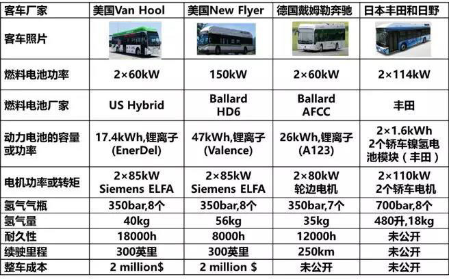 近年來,燃料電池客車示范運(yùn)營大幅推動了燃料電池技術(shù)的發(fā)展與應(yīng)用。下圖比較了國外典型的城市客車燃料電池系統(tǒng),對標(biāo)國際一流水平,目前中國已掌握了100千瓦級大功率發(fā)動機(jī)制造技術(shù)與動力系統(tǒng)設(shè)計(jì)技術(shù),建有國際上最大的燃料電池客車車隊(duì),氫耗、成本等關(guān)鍵指標(biāo)在國際上處于領(lǐng)先水平。