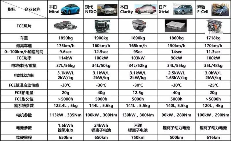 當(dāng)前,從國內(nèi)外發(fā)展情況看,國際上主要的整車企業(yè)都在進(jìn)行燃料電池轎車開發(fā)。表1是目前已經(jīng)發(fā)布燃料電池轎車的主要參數(shù),其中最具代表性的是豐田Mirai,總產(chǎn)量已超過10000臺,它將會在2020年東京奧運(yùn)會上進(jìn)行示范。此外,在2018年平倉奧運(yùn)會上,現(xiàn)代的NEXO也進(jìn)行了小規(guī)模示范,取得了很好效果。除了圖1所提到的企業(yè),寶馬也宣稱明年將推出燃料電池跑車。針對乘用車空間緊湊的特點(diǎn),目前已發(fā)布的燃料電池轎車的動力系統(tǒng)集成度不斷提高。例如本田、奔馳所開發(fā)的燃料電池系統(tǒng),已經(jīng)可以在空間上直接替代傳統(tǒng)內(nèi)燃機(jī)。
