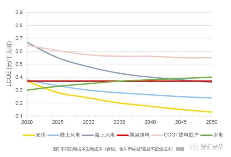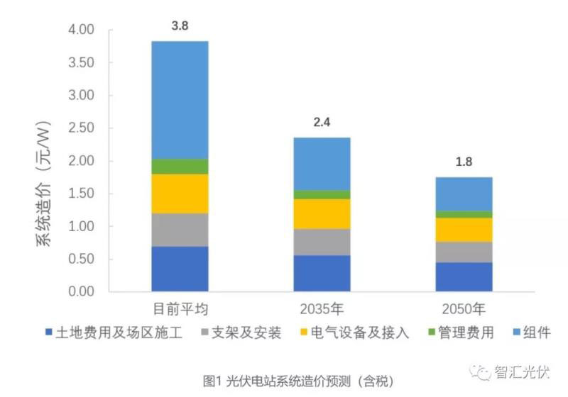 到2035年和2050年新增光伏發(fā)電成本相比當(dāng)前預(yù)計約下降50%和70%,達到0.2元/kWh和0.13元/kWh。