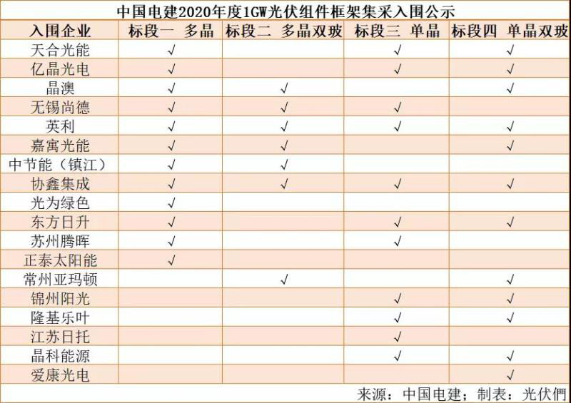 12月16日,中國電建2020年度1GW光伏組件、逆變器框架集采項(xiàng)目公示入圍結(jié)果,天合、億晶、晶澳、晶科、樂葉、英利、協(xié)鑫等18家企業(yè)入圍組件集采,陽光電源、上能、科士達(dá)、華為等10家企業(yè)入圍逆變器集采,具體如下表。