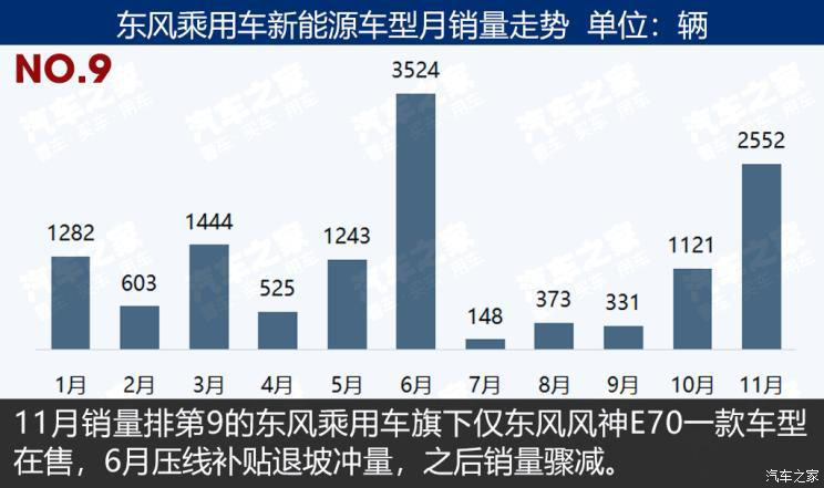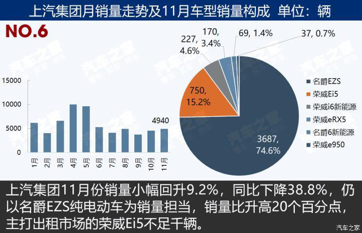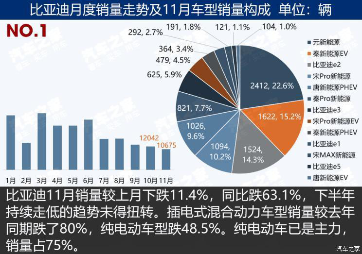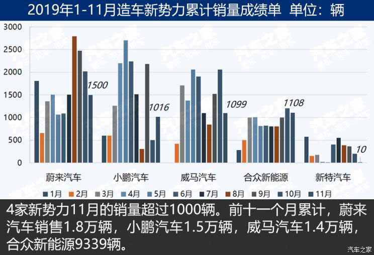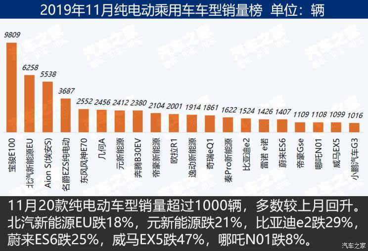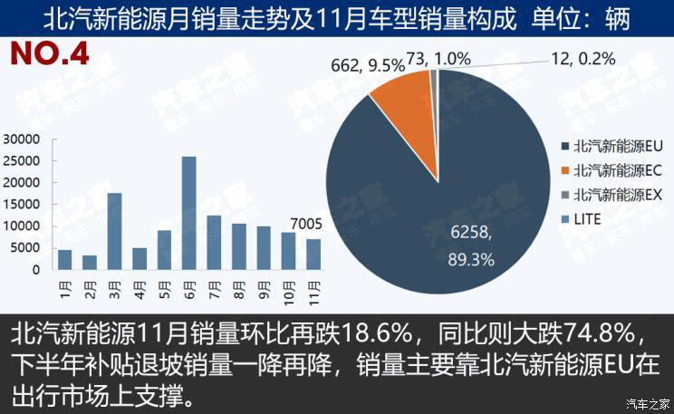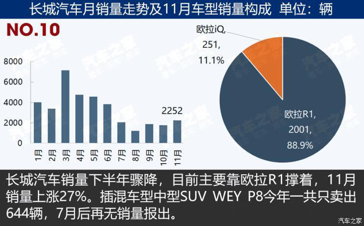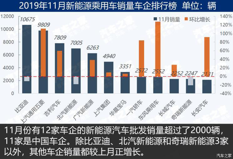 11月國內新能源乘用車批發(fā)銷售8.03萬輛,雖環(huán)比小幅回升,但較去年同期依然出現40%的較大降幅,往常的“年底效應”沒再出現,新能源車市依然處于下行通道。企業(yè)層面,僅冠軍比亞迪一家的銷量超過萬輛,其他都不足萬輛,而且只要銷量能超2000輛,就能上Top 10榜單,行業(yè)過冬氣息可以說是很濃郁了。