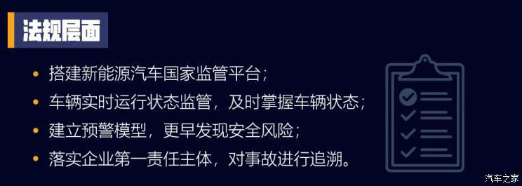 相關(guān)部門逐步搭建了新能源汽車國家監(jiān)管平臺體系架構(gòu),一方面通過新能源汽車企業(yè)平臺運(yùn)行監(jiān)管和車輛實時運(yùn)行狀態(tài)監(jiān)管,及時準(zhǔn)確掌握車輛技術(shù)狀態(tài);另一方面,促進(jìn)企業(yè)第一責(zé)任主體的落實,實施新能源汽車安全預(yù)警、事故報警和事故追溯。同時,相關(guān)部門也會公開監(jiān)控宏觀統(tǒng)計數(shù)據(jù),對事故責(zé)任進(jìn)行分析鑒定,對企業(yè)、地方政府和國家主管部門出具的事故報告進(jìn)行評判。