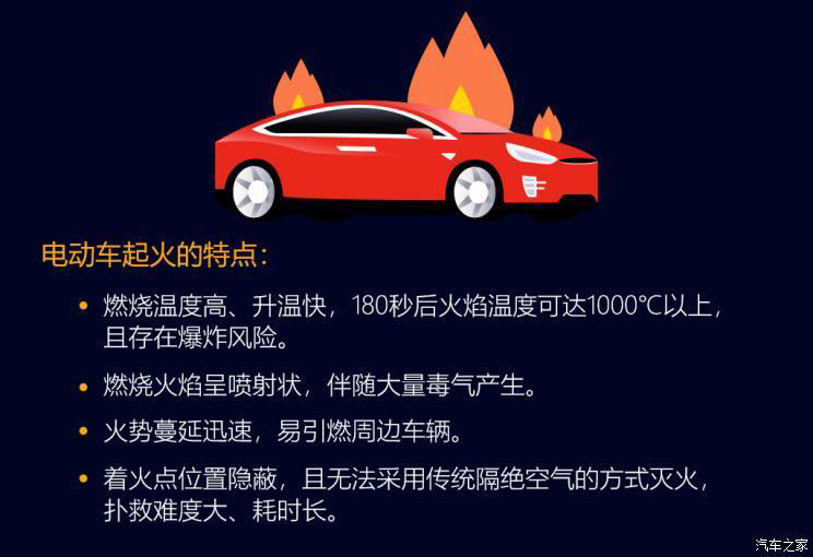 首先,電池燃燒會產(chǎn)生化學(xué)反應(yīng),釋放大量有毒氣體,吸入后導(dǎo)致瞬間窒息中毒而亡;其次,電池起火燃燒溫度高、速度快,起火后60秒,溫度即可達(dá)到200℃,180秒后,火焰溫度就會達(dá)到1000℃以上,且存在爆炸風(fēng)險;第三,受電池保護(hù)殼的限制,燃燒火焰往往呈噴射狀,噴射的強(qiáng)度大、距離長,更易引燃周邊車輛;第四,著火點位置相對隱蔽,且無法用傳統(tǒng)的隔絕空氣的方式進(jìn)行滅火,撲救難度大,且有復(fù)燃的可能。