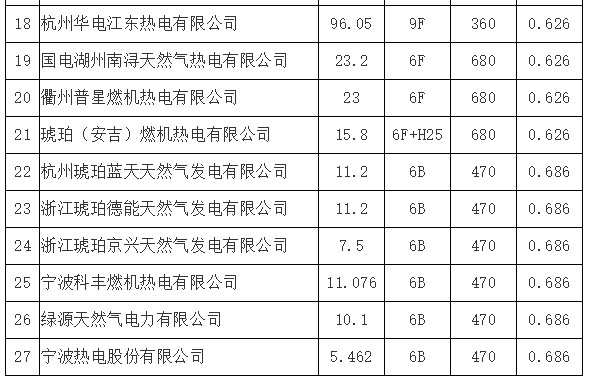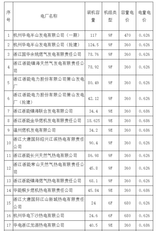 浙江省天然氣發(fā)電企業(yè)上網(wǎng)電價表