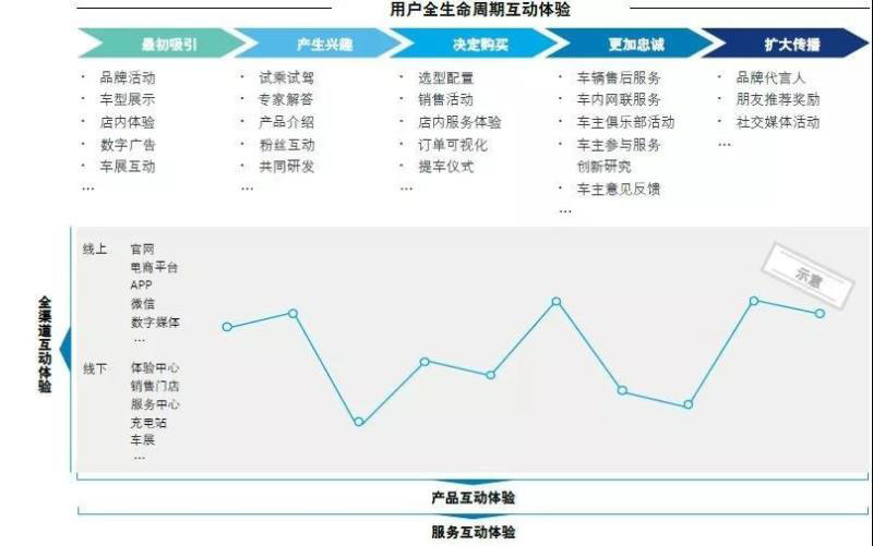 用戶(hù)思維是互聯(lián)網(wǎng)思維的核心,是讓用戶(hù)參與到產(chǎn)品研發(fā)、品牌建設(shè)、業(yè)務(wù)發(fā)展的各環(huán)節(jié)之中,而不再只是單純的產(chǎn)品購(gòu)買(mǎi)者。從最初吸引用戶(hù)關(guān)注、到激活用戶(hù)開(kāi)啟互動(dòng)、再到培養(yǎng)成為忠實(shí)粉絲、再到轉(zhuǎn)化為新能源汽車(chē)產(chǎn)品或服務(wù)的用戶(hù)、以及最終成為品牌的忠實(shí)用戶(hù)與支持者,用戶(hù)的全生命周期旅程建立在與品牌的持續(xù)互動(dòng)之上,當(dāng)然這些互動(dòng)體驗(yàn)必須由全渠道體驗(yàn)、產(chǎn)品體驗(yàn)和服務(wù)體驗(yàn)來(lái)做支撐。