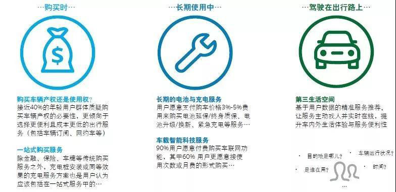 根據(jù)全球汽車(chē)行業(yè)消費(fèi)者調(diào)研結(jié)果顯示,在中國(guó)用戶(hù)中,接近40%的年輕消費(fèi)群體更傾向于購(gòu)買(mǎi)車(chē)輛使用權(quán)而非產(chǎn)權(quán),以享受成本更低、更便捷的出行服務(wù)。未來(lái)通過(guò)使用權(quán)交易的銷(xiāo)售服務(wù)存在很大的市場(chǎng)空間,打包特定時(shí)段內(nèi)的車(chē)輛使用權(quán)及所需的各項(xiàng)服務(wù)(充電、保險(xiǎn)、保養(yǎng)維修、道路救援等)提供一種新的購(gòu)買(mǎi)服務(wù),可以搶占新型擁車(chē)?yán)砟钣脩?hù)市場(chǎng)。