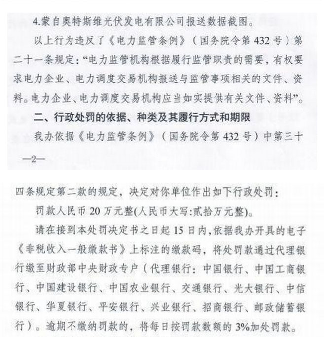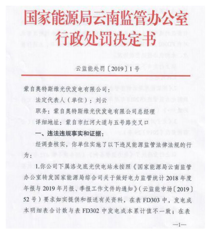 日前,國(guó)家能源局云南監(jiān)管辦公室發(fā)布了一則行政處罰決定書,文件顯示,經(jīng)云南能監(jiān)辦調(diào)查核實(shí),蒙自?shī)W特斯維光伏發(fā)電有限公司下屬洛戈底光伏電站未按照云南能監(jiān)辦有關(guān)文件要求如實(shí)提供和報(bào)送有關(guān)資料,后期未按整改要求對(duì)存在的問題進(jìn)行解釋,未進(jìn)行整改,未向云南能監(jiān)辦報(bào)送整改情況,由此被處罰款人民幣20萬(wàn)元整。